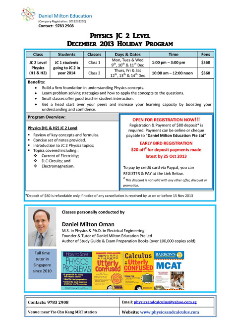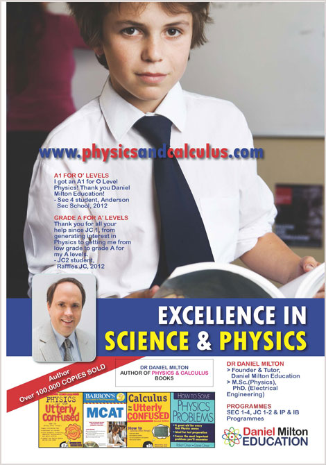In 2009, Dr. Daniel Milton Oman expanded the scope of PhysicsandCalculus.com to include private tutoring sessions in Singapore, which saw the birth of Daniel Milton Education. Conducted in small groups or on an individual basis, its tutorials are specifically created by Dr. Daniel Milton Oman for the Advanced Placement (AP) Physics Exams, International General Certificate of Secondary Education (IGCSE) and Singapore’s Integrated Programmes (IP), O’ Levels, A’ Levels Exams and International Baccalaureate Diploma Programmes (IB).