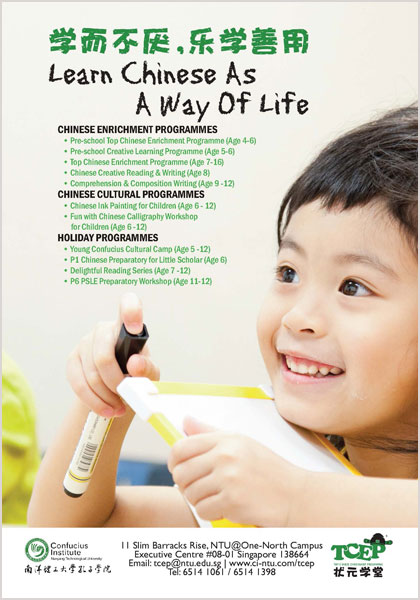 Learn Chinese as a way of life - is a tenet upon which Confucius Institute’s Top Chinese Enrichment Programme (TCEP) is founded on. Designed primarily for children aged 4 to 16 years old, this programme was established to build a solid Chinese linguistic foundation to help students excel in their examinations as well as to enhance their knowledge of Chinese culture and foster confidence in communication skills applicable to their daily lives. Through these programmes, students get exposed to the various dimensions of language appreciation. Exposures such as these not only widen their horizons, but also offer them an indepth understanding of the language and its enriched history, offering the students a priceless experience as Singapore and China look set to continue strengthening their bilateral ties and bonds. Key programmes offered here includes the following:
