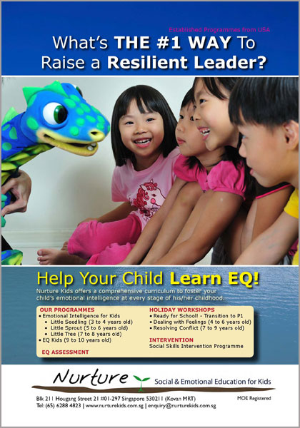 Children can progress through the Emotional Intelligence for Kids Series for a comprehensive and developmentally appropriate learning experience as their emotional and social needs evolve. Children can also get a booster on specific skills through Nurture Kids’s holiday workshops. Programmes are available for children aged 3 to 10years old. For children with serious social difficulties, a social skills intervention programme is also available.
