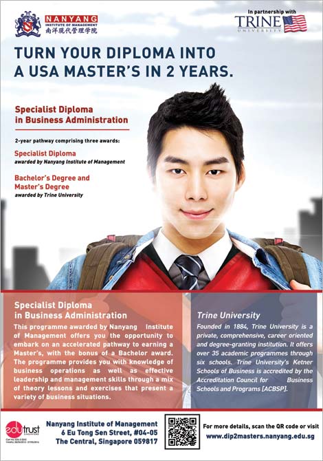 One such programme is the Specialist Diploma in Business Administration awarded by Nanyang Institute of Management, which offers the opportunity to embark on an accelerated pathway to earning a Master’s, with the bonus of a Bachelor award from the Trine University, USA.