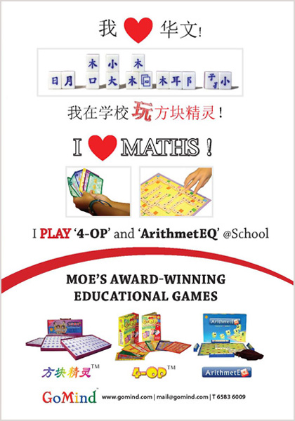 GoMind is the publisher of Award Winning Educational Games copyrighted by MOE Singapore. More than 200 Schools in Singapore actively used one of GoMind Maths and Chinese Educational Games to aid in student learning. GoMind is the organiser of National Challenge for ArithmetEQ and Creative tile Genie.